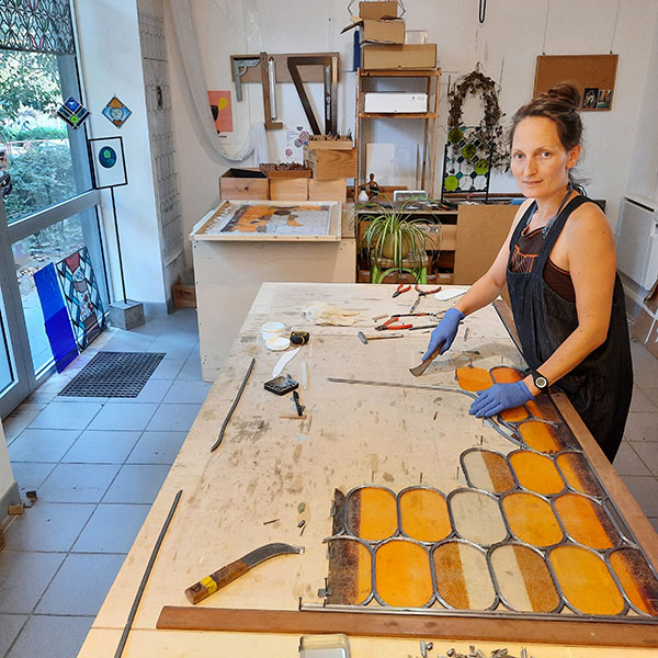 Après un parcours en arts plastiques à l’université Panthéon-Sorbonne, Delphine Legros se forme au vitrail au Centre International du Vitrail de Chartres. En 2018, elle fonde son propre atelier, Fab Luz Vitrail, d’abord à Pantin, puis s’installe en Pays de Fontainebleau il y a deux ans.