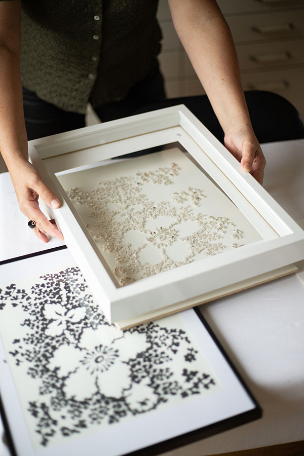 Ses créations, entièrement réalisées à la main, allient l’élégance des Années folles et des arts décoratifs avec une touche de modernité. Elle utilise des matériaux chinés et anciens, et même ses propres dentelles brodées.
